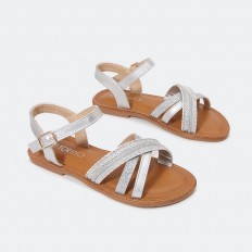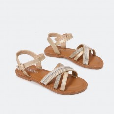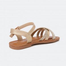 صندل بناتي بتصميم من شرائط الجلد اللامعة وشريطة ذو نقشة مميزة مع حزام كاحل و ابزيم بتصميم مسطح عيشي تجربة من الاناقة لا حدود لها