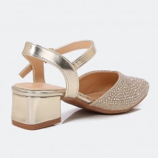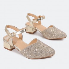 بتصميم أنيق نقدم لكِ هذا الصندل ذو مقدمة مدببة مرصعة بالستراس مع ابزيم أمامي للإغلاق، اختاري المثالية لطفلتك