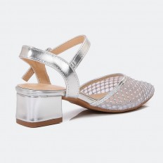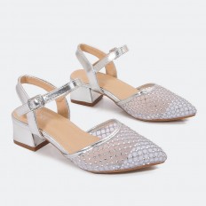 يُعد هذا الصندل خيار مثالي لطفلتك، تصميم أنيق ذو خامة مميزة بمقدمة من التول المرصع بالستراس، ذو كعب 3سم ومقدمة مدببة متوفر باللونين الأبيض والفضي