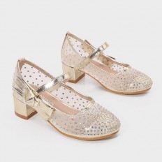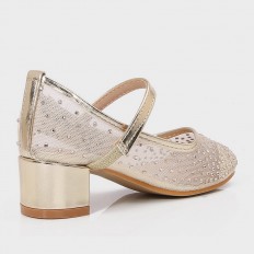 5 cm round toe heels, tulle material decorated with strass, with front buckle with side bowionka, coordinated with different looks, choose it for your little one's look