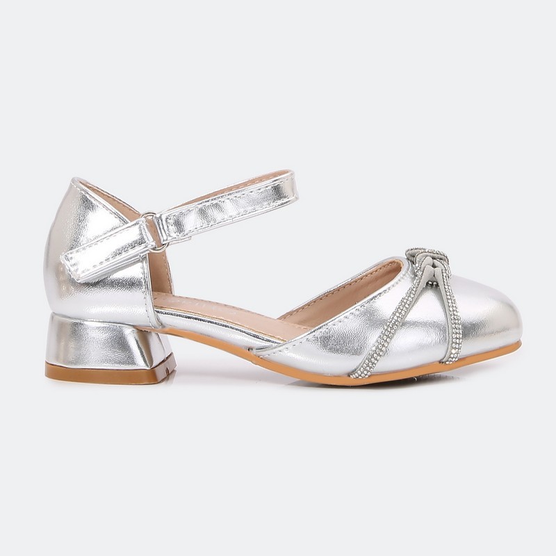 يُعد هذا الصندل بكعب 2 سم خيار مثالي لطفلتكم , تصميم فخم مزين بحبال الكريستال , مع حزام لاصق للإغلاق