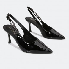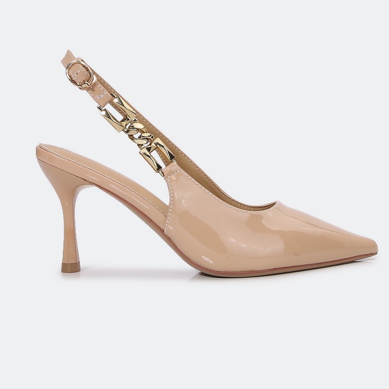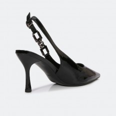 نقدم لكِ هذا الصندل بتصميم عملي ومريح وأنيق من الجلد اللامع ذو كعب رفيع 7سم مع حزام كاحل للإغلاق مزين باكسسوار, متوفر بألوان لا غنى عنها