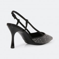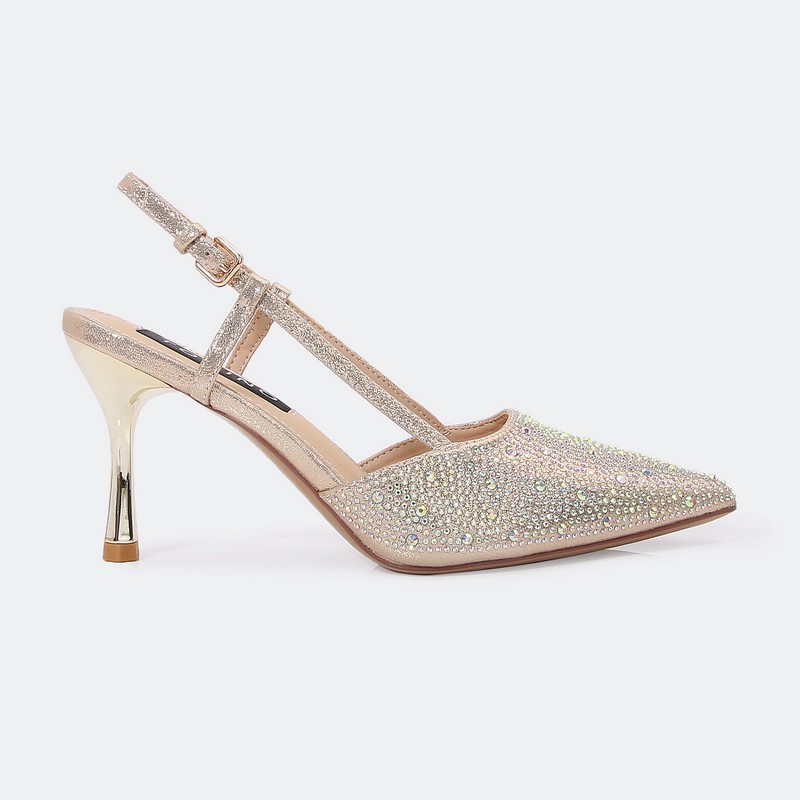 لا غنى عن هذا الصندل في تشكيلة أحذيتك , ذو كعب 7 سم وتصميم كلاسيكي بمقدمة مغلقة مزين بحبات الستراس . حزام كاحل و إبزيم للإغلاق , مناسب لكافة الأوقات