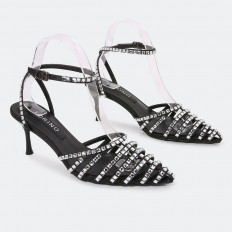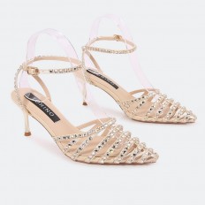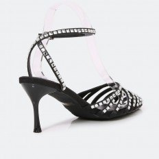 تألقي مع هذا الصندل بكعب رفيع 7 سم , تصميم فخم بمقدمة مغلقة مزين بأحجار لامعة , حزام كاحل مع إبزيم للإغلاق