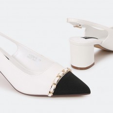 سيصبح هذا الصندل المفضل لديكِ , ذو كعب 4 سم وتصميم عصري بمقدمة مغلقة , مزين بسلسلة ذهبية اللون , مريح ومناسب للإستخدام اليومي