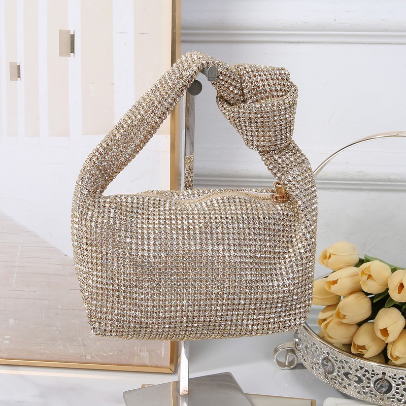 أضيفي لمسة من الأناقة والرقي إلى إطلالاتك مع هذه الحقيبة، مزينة بالكريستال البراق، سحاب للإغلاق