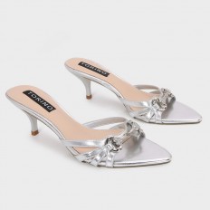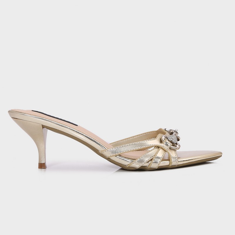 نقدم لكِ نعال كعب 5 سم من الجلد الصناعي اللامع مزين باكسسوار أنيق, ذو مقدمة مدببة، ومتوفر بألوان أنيقة