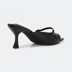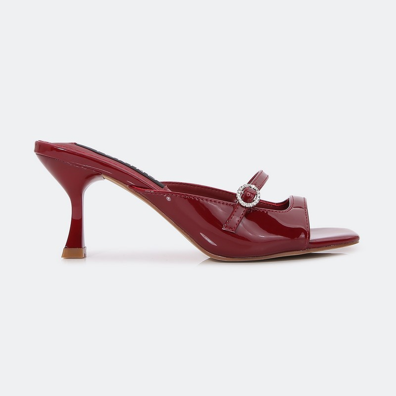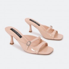 نقدم لكِ نعال كعب 5 سم من الجلد الصناعي اللامع مزين بإكسسوار ناعم , ذو مقدمة مربعة ومتوفر بألوان أنيقة