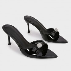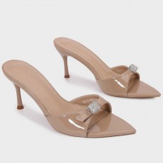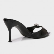 لا غنى عن هذا النعال ضمن تشكيلة أحذيتك، ذو كعب رفيع 7سم ومقدمة مدببة من الجلد اللامع المزين باكسسوار فضي، مناسب لكافة الأوقات