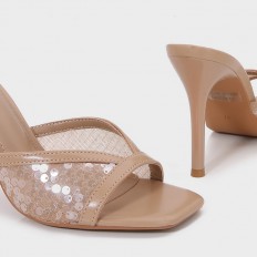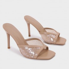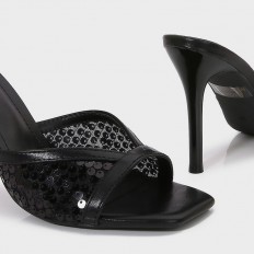 تألقي مع هذا النعال من تورينو، ذو كعب 10 سم رفيع، ومقدمة مربعة من التول المزين بالترتر، يمكن تنسيقه مع خيارات مختلفة