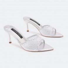 تألقي مع هذا النعال ذو كعب 7 سم , تصميم عصري بمقدمة مدببة مفتوحة وجزء من التول مزين بالستراس , مناسب للأوقات المسائية