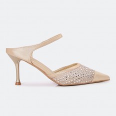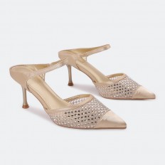أضيفي الأناقة لإطلالتك مع هذا الكعب 7 سم، بتصميم جذاب ذو مقدمة مدببة بجزء من الساتان، وجزء من التول المزين بالستراس