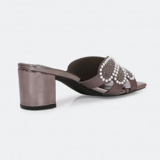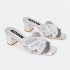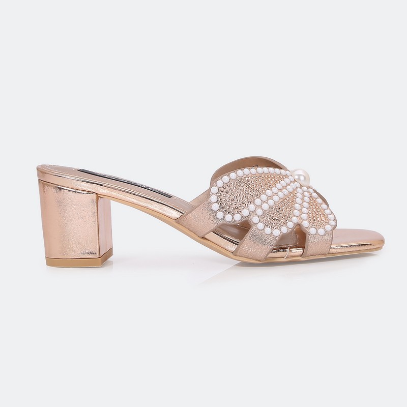 نقدم لكِ نعال كعب عريض 5 سم، تصميم فخم مزين بالستراس وااللؤلؤ بشكل الفراشة, يمكن تنسيقه مع إطلالات مختلفة