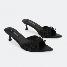 تألقي مع هذا النعال من تورينو، ذو كعب أنيق 5 سم ، بمقدمة مفتوحة مدببة مرصعة بالستراس ومزينة بفيونكا، متوفر بألوان أساسية