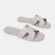 نقدم لكِ نعال مسطح من الجلد الصناعي بنقشة جلد الأفعى, بتصميم عملي و أنيق، مناسب للإستخدام اليومي