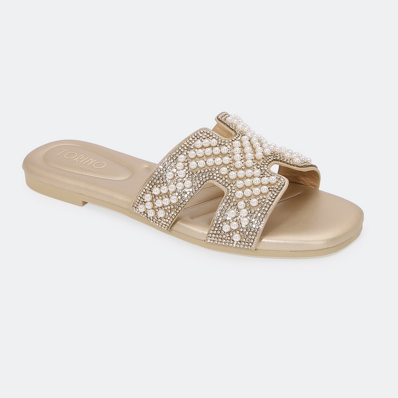 تألقي مع هذا النعال المسطح من تورينو, تصميم فخم ، مزين بالستراس واللؤلؤ , ألوان لافتة، مناسب لكافة الأوقات