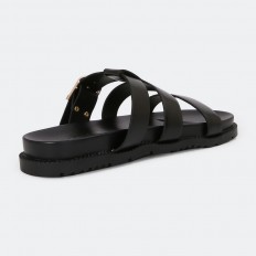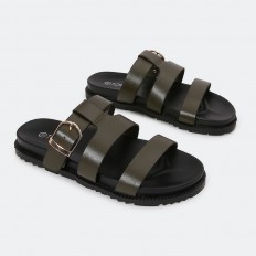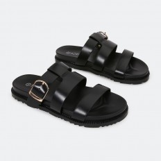 نعال مسطح مريح وعملي، ذو تصميم ناعم بثلاثة أحزمة مزين بقفل، مناسب للإستخدام اليومي