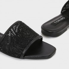 نقدم لكِ هذا النعال من تورينو، ذو تصميم مميز بجزء من التول المزين بالستراس بشكل هندسي مميز, متوفر بألوان يمكن تنسيقها مع إطلالات مختلفة