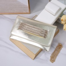 Shiny crystal embellished evening bag with detachable chain, available in colors that can be coordinated with different looks, suitable for parties