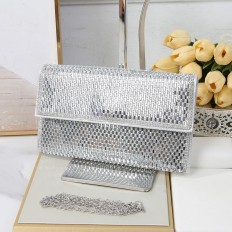 We offer you a wonderful evening bag suitable for parties, decorated with shiny rhinestones. It has a distinctive design, available in colors that can be coordinated with different looks, and a detachable chain strap.