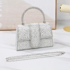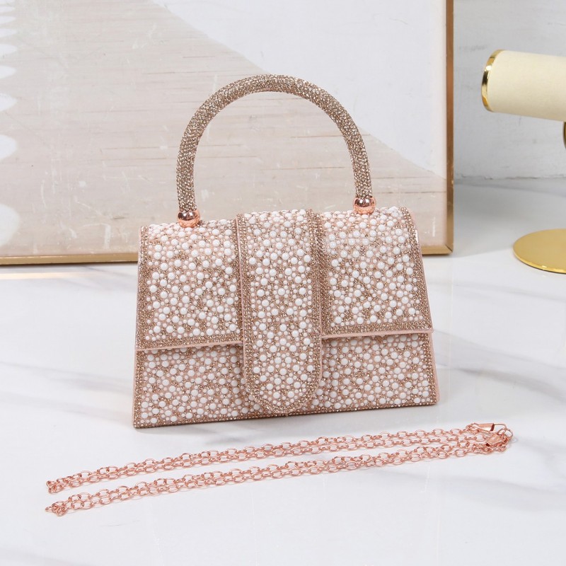 We present to you a stunning evening bag suitable for parties, adorned with sparkling pearls, feaTorinog a handle set with crystals, available in colors that can be coordinated with different looks.