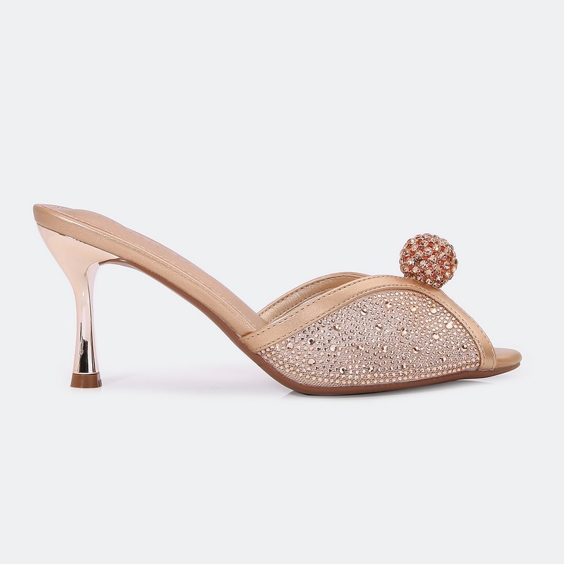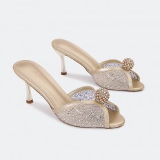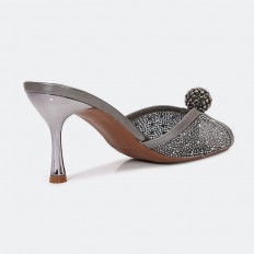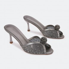 This slippers is essential in your shoe collection, with a stylish and shiny 7 cm heel, adorned with strass and a soft, glossy accessory, available in must-have colors.