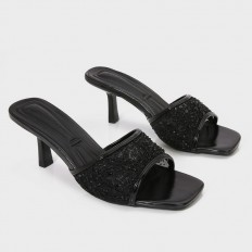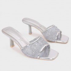 ZXQ1898 Square-toed heeled slippers with a tulle part.