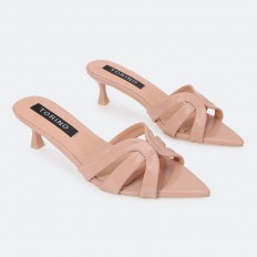 Practical and elegant heeled slippers with a pointed toe and shiny synthetic leather, suitable for everyday use.