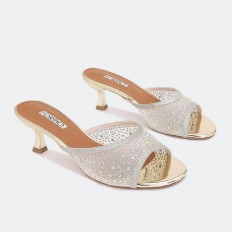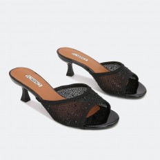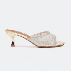 Slippers with a small heel of 4 cm, with an attractive design of tulle decorated with strass, for an unparalleled glamorous look. Order it now from Torino