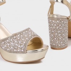 Shine with these 8 cm heeled sandals, feaTorinug a luxurious design and a rounded toe adorned with strass and pearls, an ankle strap with a buckle closure, available in classic colors.