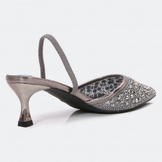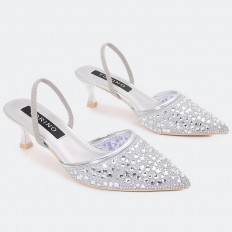 Shine with these 5 cm heel sandals, closed pointed toe decorated with sparkling strass beads, ankle strap and buckle closure, suitable for all times