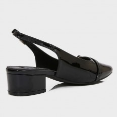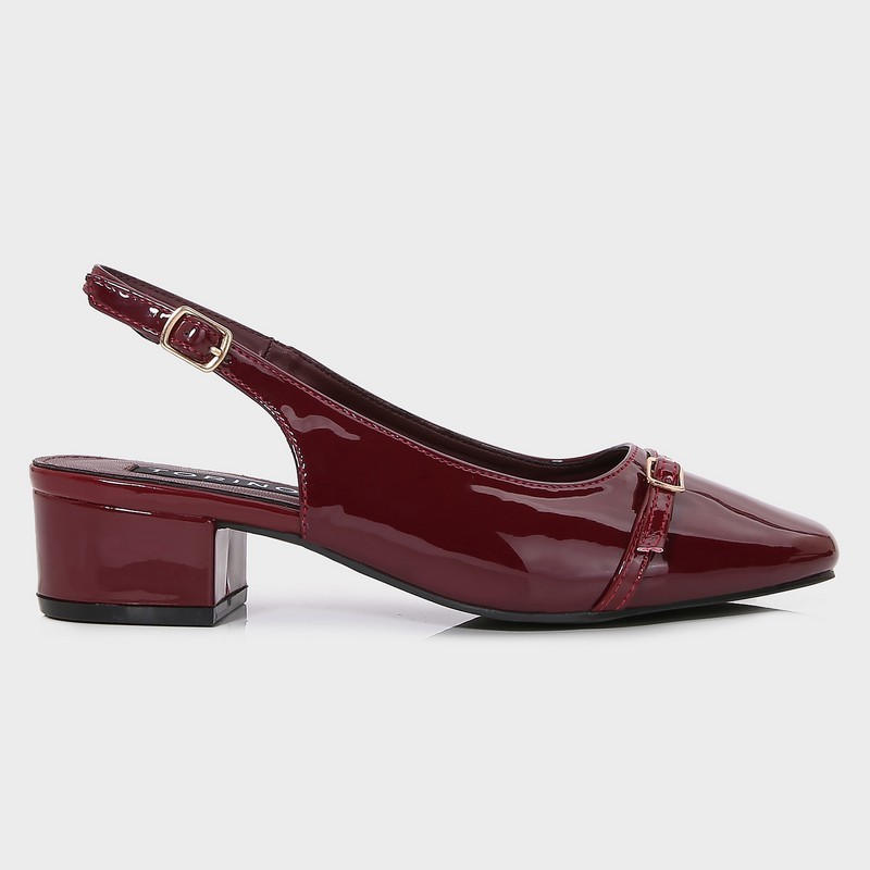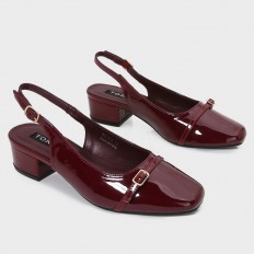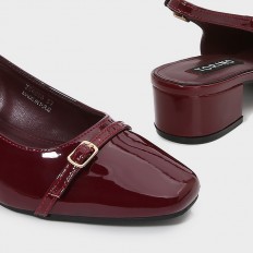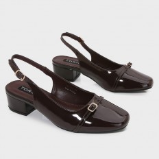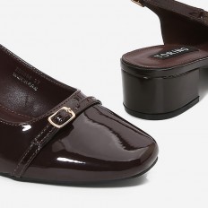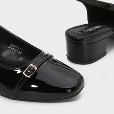 With a stylish and practical design, this sandal is a great choice for your everyday look. It features a 3 cm wide heel, made from shiny faux leather with a closed toe, ankle strap, and buckle closure.