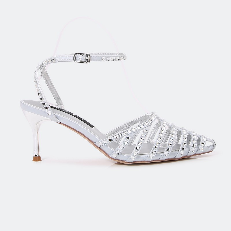 Shine with these sandals with thin 7 cm heels, a luxurious design with a closed toe and decorated with shiny stones, ankle strap with buckle closure