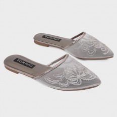 Flat slippers from Torino feaTorinog a luxurious design and a closed toe adorned with embroidered tulle and embellished with strass, available in essential colors within your shoe collection.