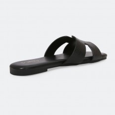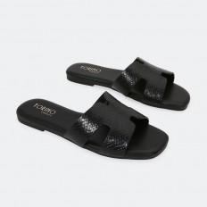 We offer you flat slippers made of synthetic leather with a snakeskin pattern, with a practical and elegant design, suitable for everyday use.