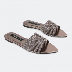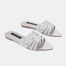 Flat slippers with a modern design adorned with rhinestones, easy to wear, and can be coordinated with various looks.
