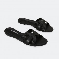 We offer you flat slippers made of luxurious synthetic leather, with a snakeskin pattern, in a practical and elegant design suitable for everyday use.