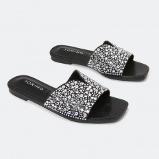 We offer you these flat slippers with a square toe, decorated with a strass and it can be coordinated with different options